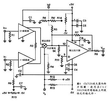 以一个100MHZ增益控制频宽而言,CLC520令到AGC/ALC环路稳定化更为简单,它也可用作为调幅及压控滤波器,在增益控制输入端施加0V时,增益是最小,又施加+2V时,增益为最大——图6。网上供应有DIP及SOIC封装的CLC520试用板(注4)