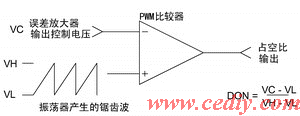 2. 占空比发生器DCG TPS54310内部采用电压模式的脉宽调制器,PWM比较器把误差放大器输出的控制电压与振荡器产生的锯齿波电压进行比较以产生所需的接通占空比DON,如(图4)所示。查TPS54310数据手册中的关键特性参数表可得, VL=0.75V,VH=1.75V,所以